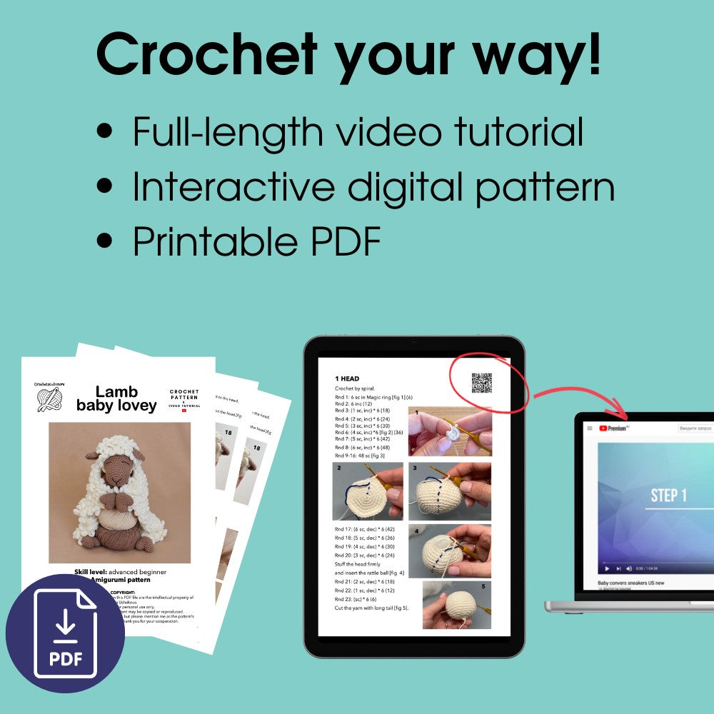 This amigurumi pattern is in PDF format with 8 pages of detailed instructions on how to make and 1-hour video tutorial with subtitles without voice.