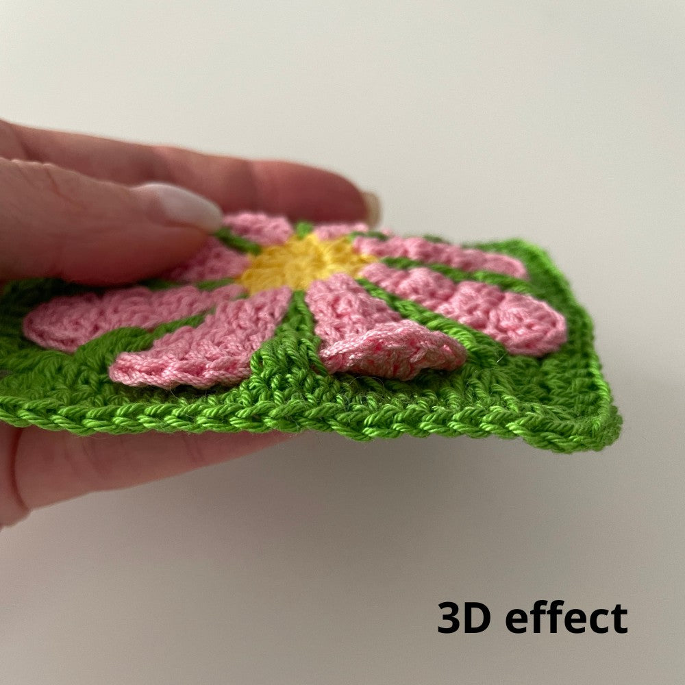 In this version of the pattern, the square is crocheted from the middle to the edges, the petals and background are created simultaneously.