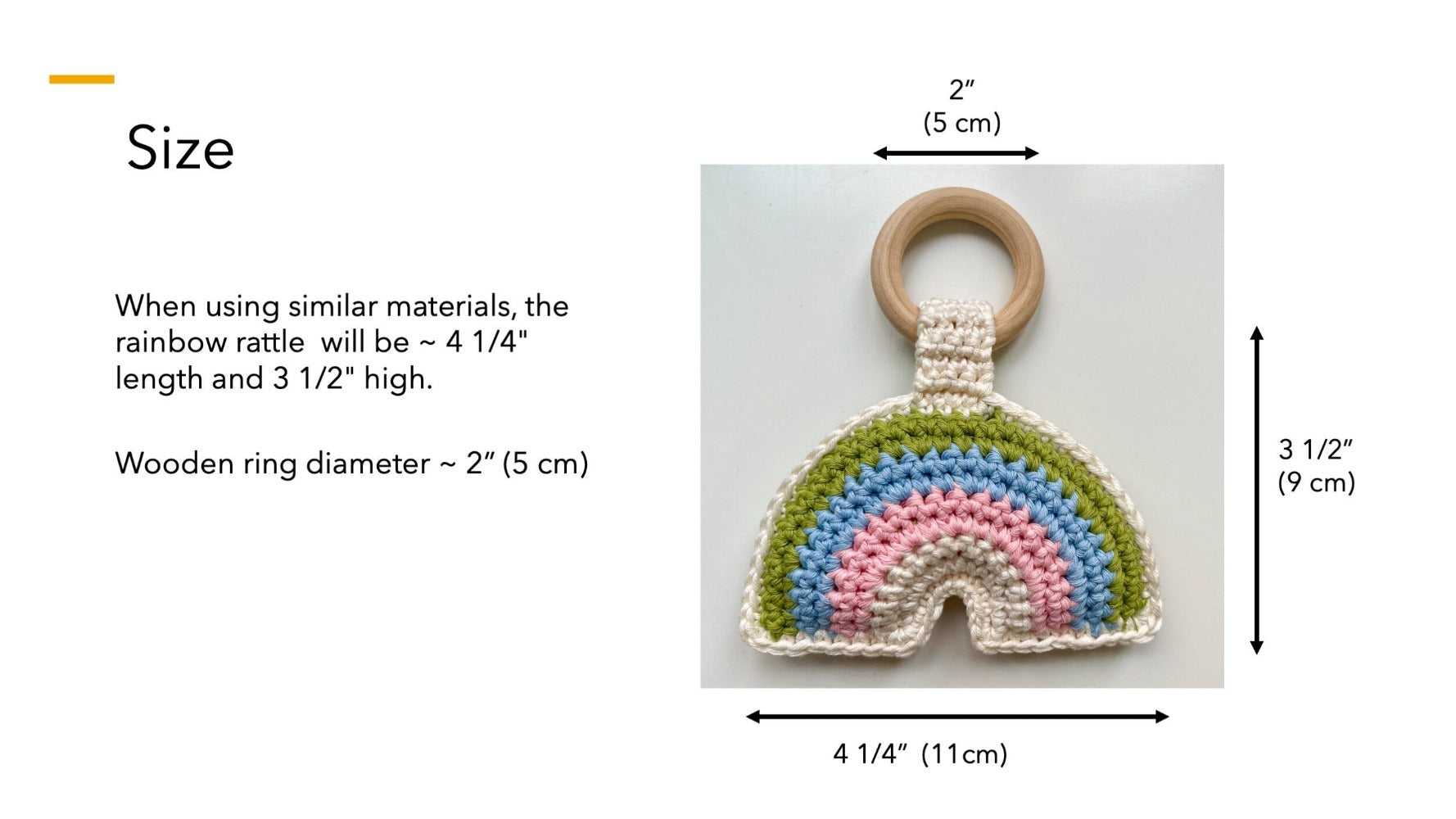 FINISH SIZE: when using similar materials, the rainbow rattle will be ~ 4 1/4" length and 3 1/2" high