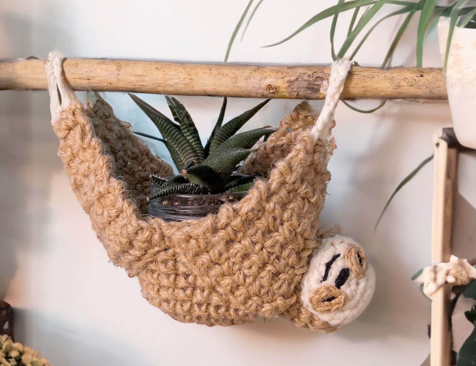 Add some fresh energy to your home decor with this adorable sloth wall plant hanger crochet pattern! The neutral tones make it easy to blend into any corner, and it's perfect for displaying your favorite houseplants. This practical and fun design also makes a unique housewarming gift. Use it for succulents, cacti, aloe, or any greenery that catches your eye. Get your pattern today and bring a touch of nature into your home!
